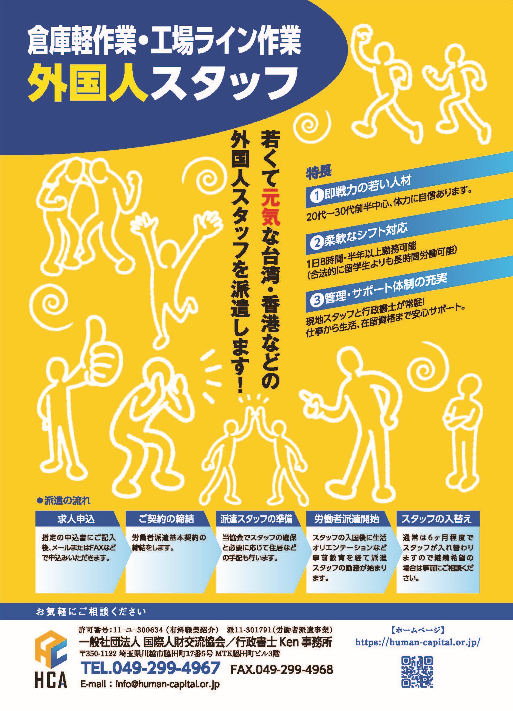 倉庫軽作業や工場ライン作業者の人材はワーホリで来日中の台湾人、香港人を6~7ヶ月間派遣可能です。