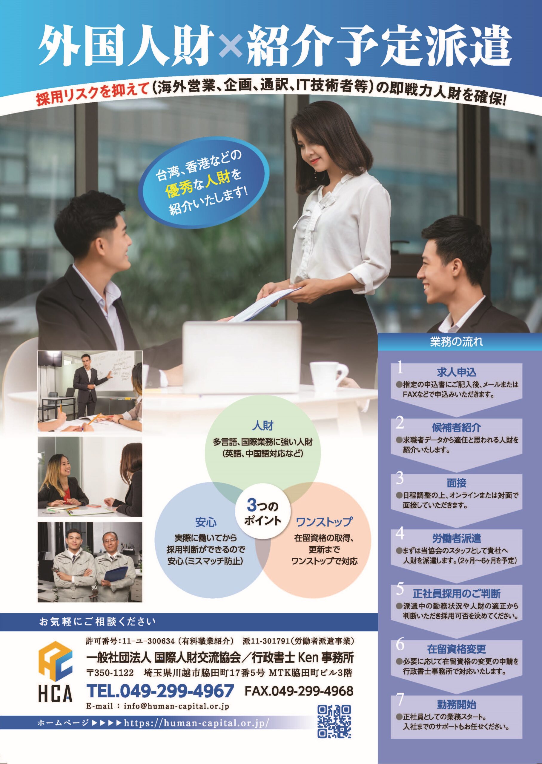 また、通訳や外国人管理のスタッフを正社員として採用したいと考えているが、ミスマッチが心配な場合は紹介予定派遣として数カ月派遣する事が可能です。